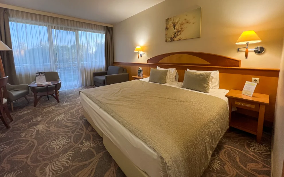 Po príchode sa nás na recepcii ujala milá pani recepčná, ktorá nám oznámila všetky dôležité informácie na pobyt a odovzdala nám karty od izby aj náramok na vstup do kúpeľov. Potom sme sa ubytovali v dvojlôžkovej izbe s balkónom. Izba bola priestranná, svetlá a vybavená elegantným nábytkom. Okrem veľmi pohodlnej manželskej postele tu bol minibar, televízia, písací stôl, stolík s kresielkami a šatníková skriňa. Nechýbalo ani kvalitné WiFi pripojenie a klimatizačný systém na chladenie aj vykurovanie. V modernej kúpeľni nám poslúžili sprchová vaňa, umývadlo, toaleta, fén, zrkadlo a sada kvalitnej kozmetiky. Našli sme tu aj župany, papuče a osušky, ktoré sme neskôr využili v kúpeľoch. Z balkóna s posedením sme mali pekný výhľad do zelene a na kúpeľné bazény. Celkovo bolo ubytovanie v tomto hoteli veľmi komfortné a vhodné ako na víkendové pobyty, tak aj na dlhšiu dovolenku.