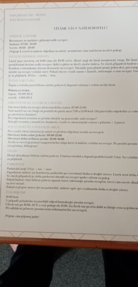 Personál hotelu byl velmi příjemný, strava dobrá, ubytování krásné, wellness úžasný. Masáž luxusní!