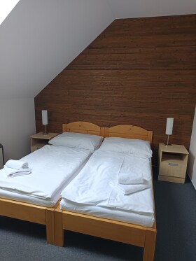 Dvojlôžková izba je zariadená 2 oddelenými posteľami, nočnými stolíkmi a príjemným posedením. Patrí k nemu vlastná moderná kúpeľňa so sprchou a sociálnym zariadením.