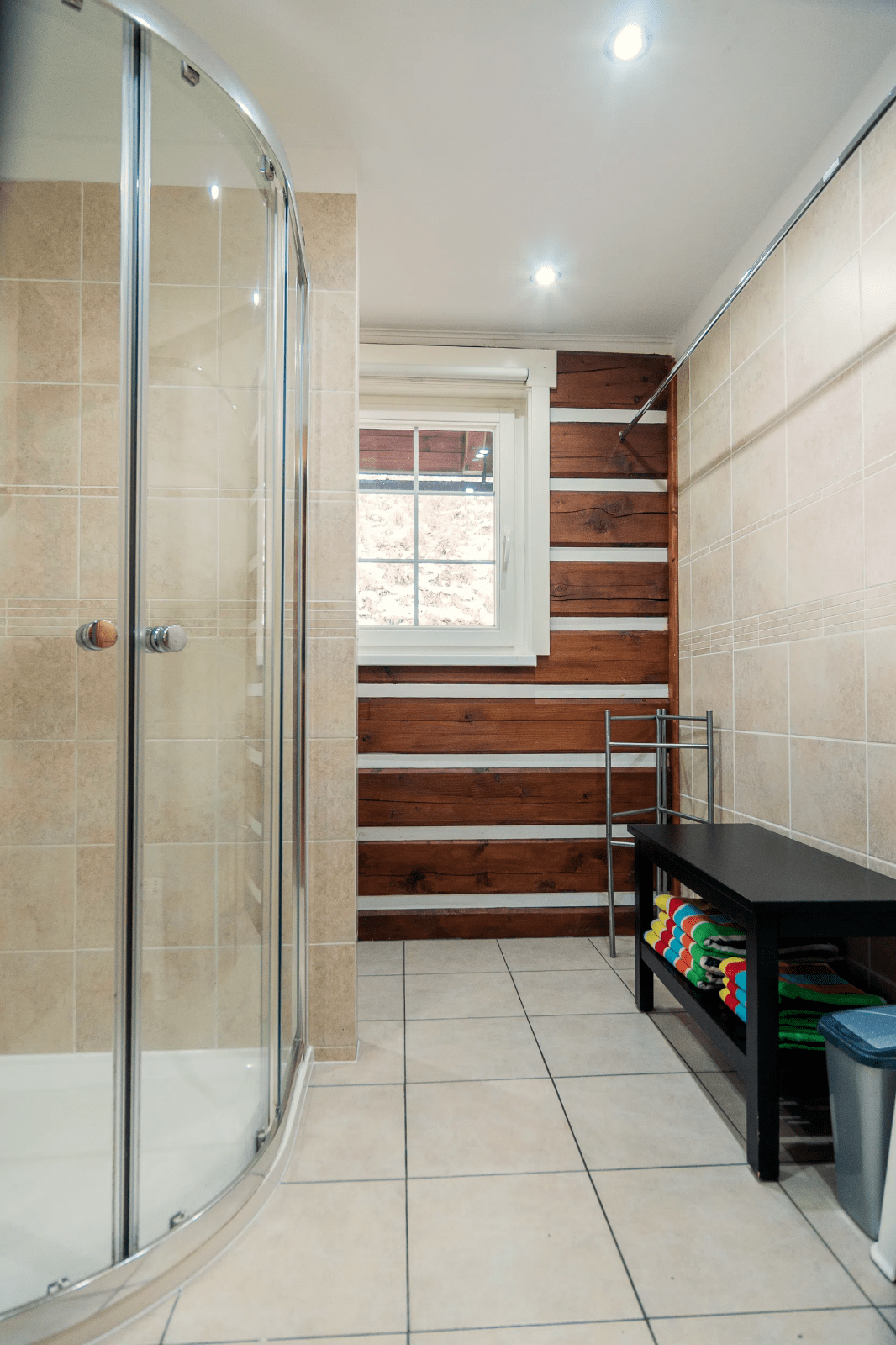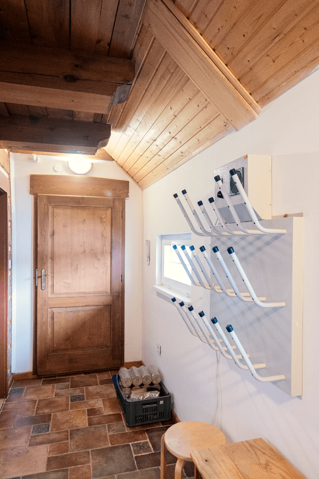 Zázemí pro sportovce: Profesionální sušák s cirkulací teplého vzduchu vysuší celoročně až 9 párů bot, zatímco vaše lyže či kola odpočívají v bezpečí uzamykatelného přístřešku. Bezpečně uložit lyže lze ve společné chodbě. Kola nebo větší množství lyží lze uschovat v uzamykatelném přístřešku z boční strany roubenky.