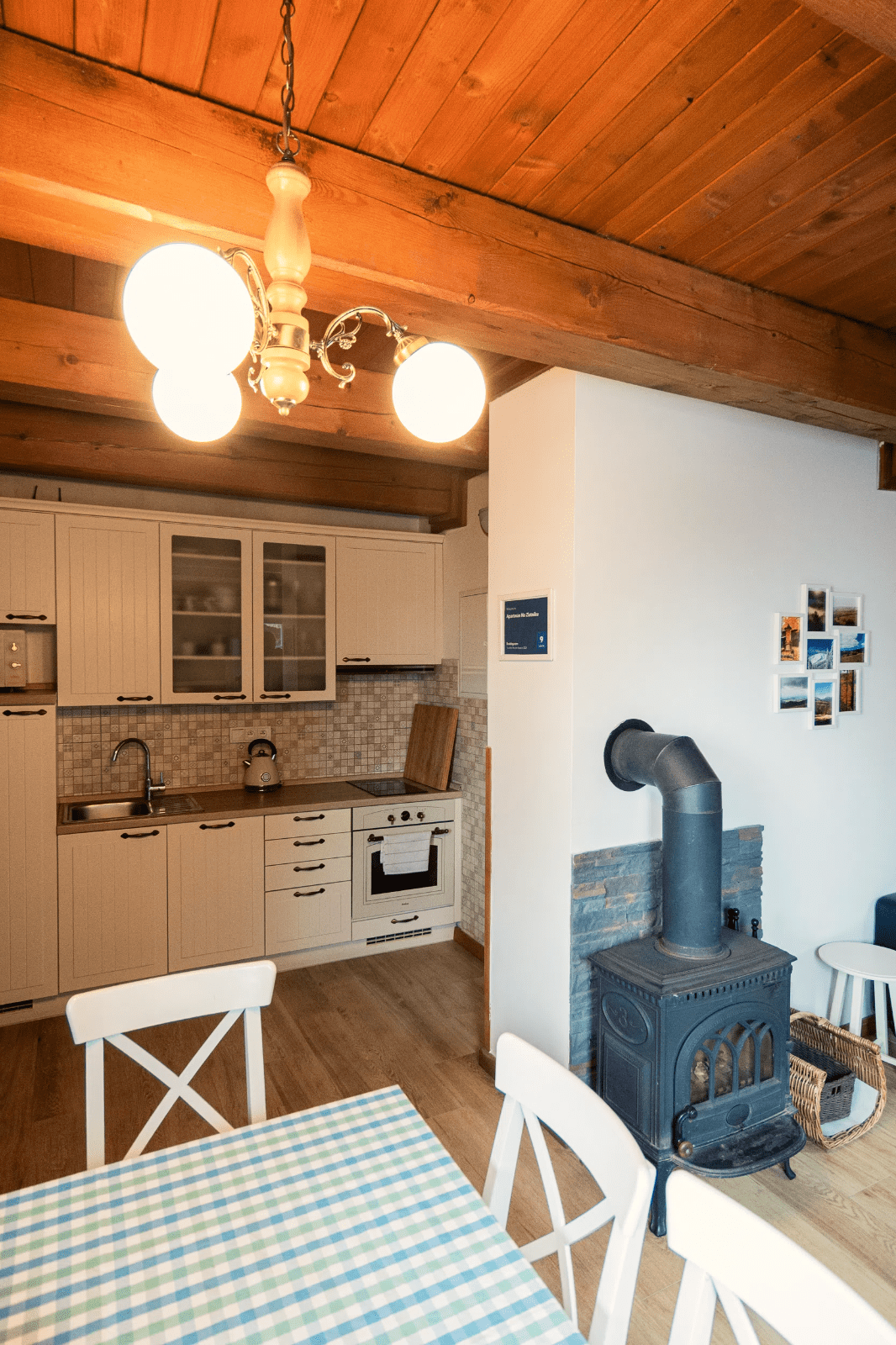 Plně vybavená kuchyně & moderní zázemí Sklokeramická deska, elektrická i mikrovlnná trouba, myčka nádobí a lednice. Pro dokonalý start dne je připraven kávovar Nespresso. Jídelní stůl pro 6 osob a útulný obývací prostor s internetovou TV.
