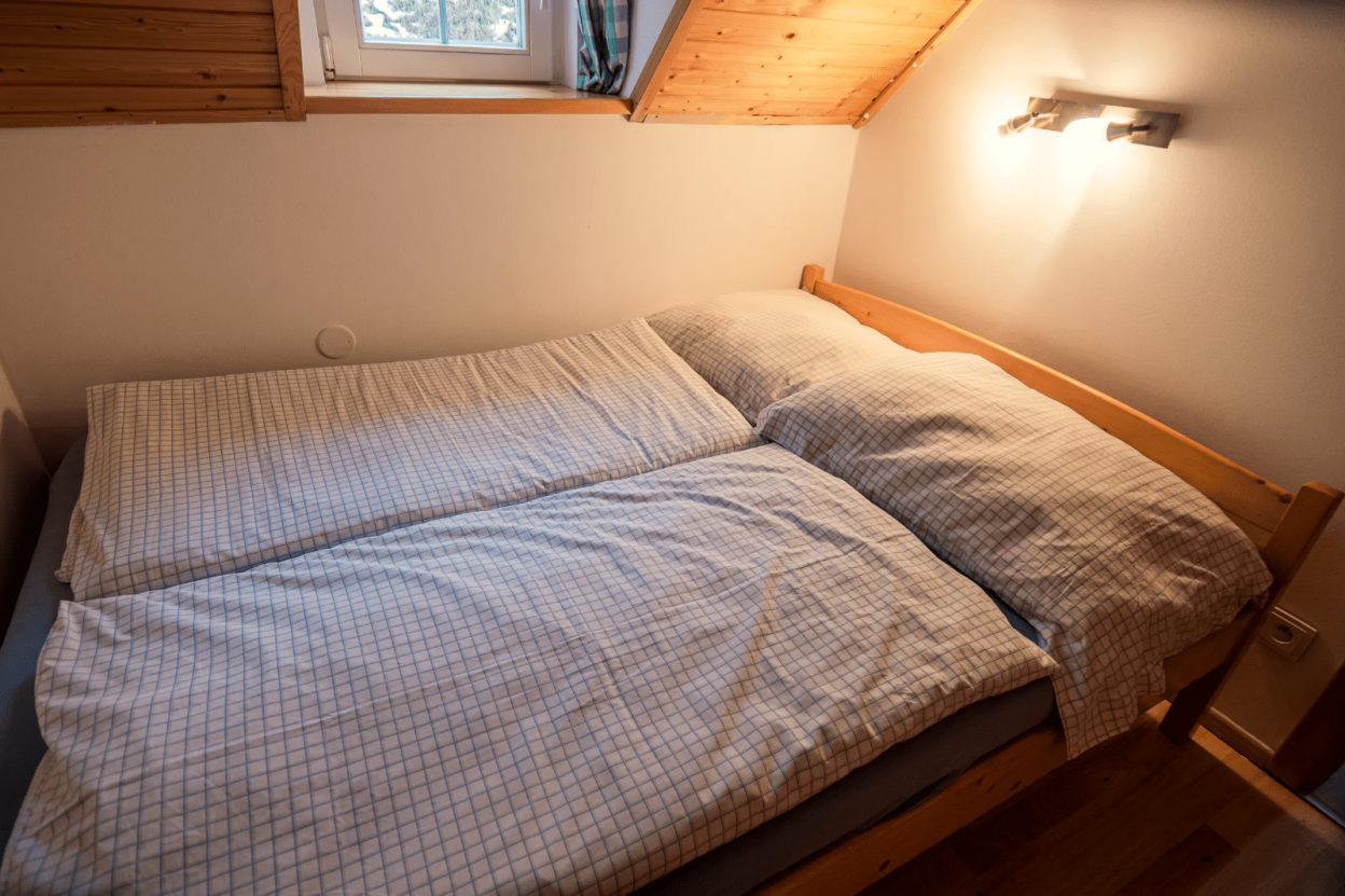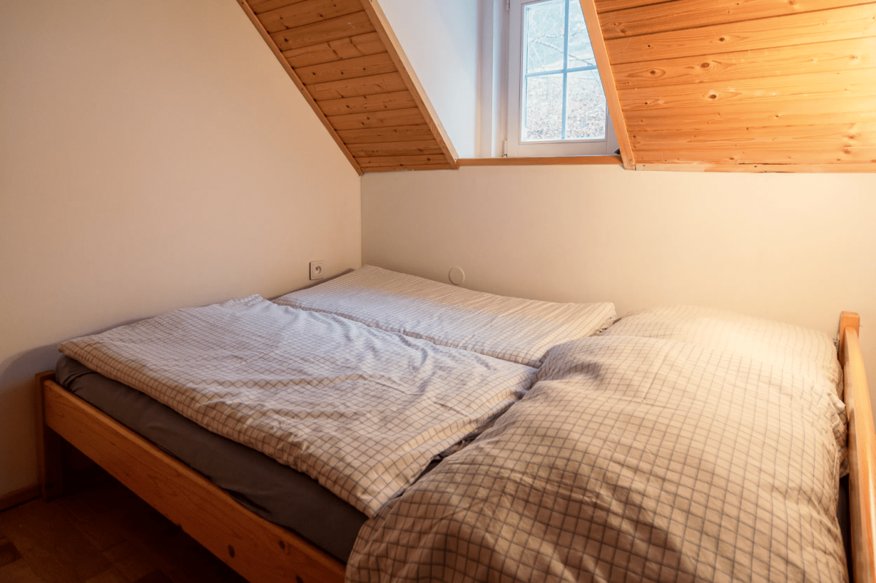 Menší ložnice (1–2 osoby): Vybavena lůžkem o šířce 140 cm, které je ideální jako komfortní jednolůžko nebo útulné dvoulůžko (např. pro děti nebo pár).