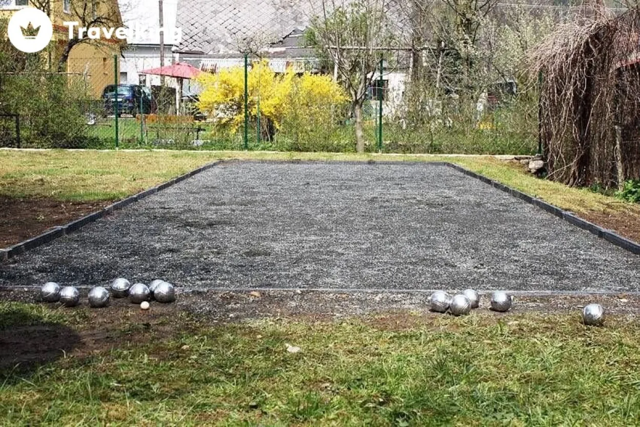 K chatě patří oplocená zahrada s parkovištěm, ohništěm s pergolou a venkovním bazénem.
