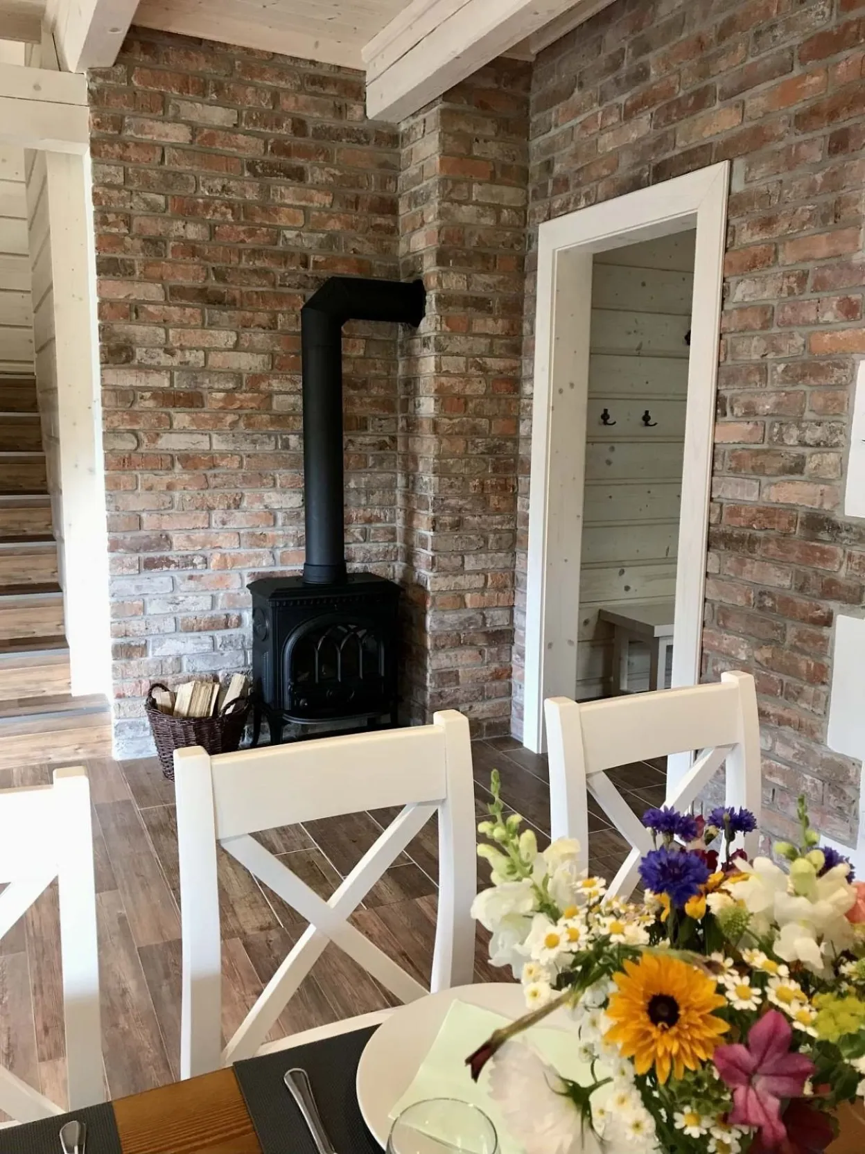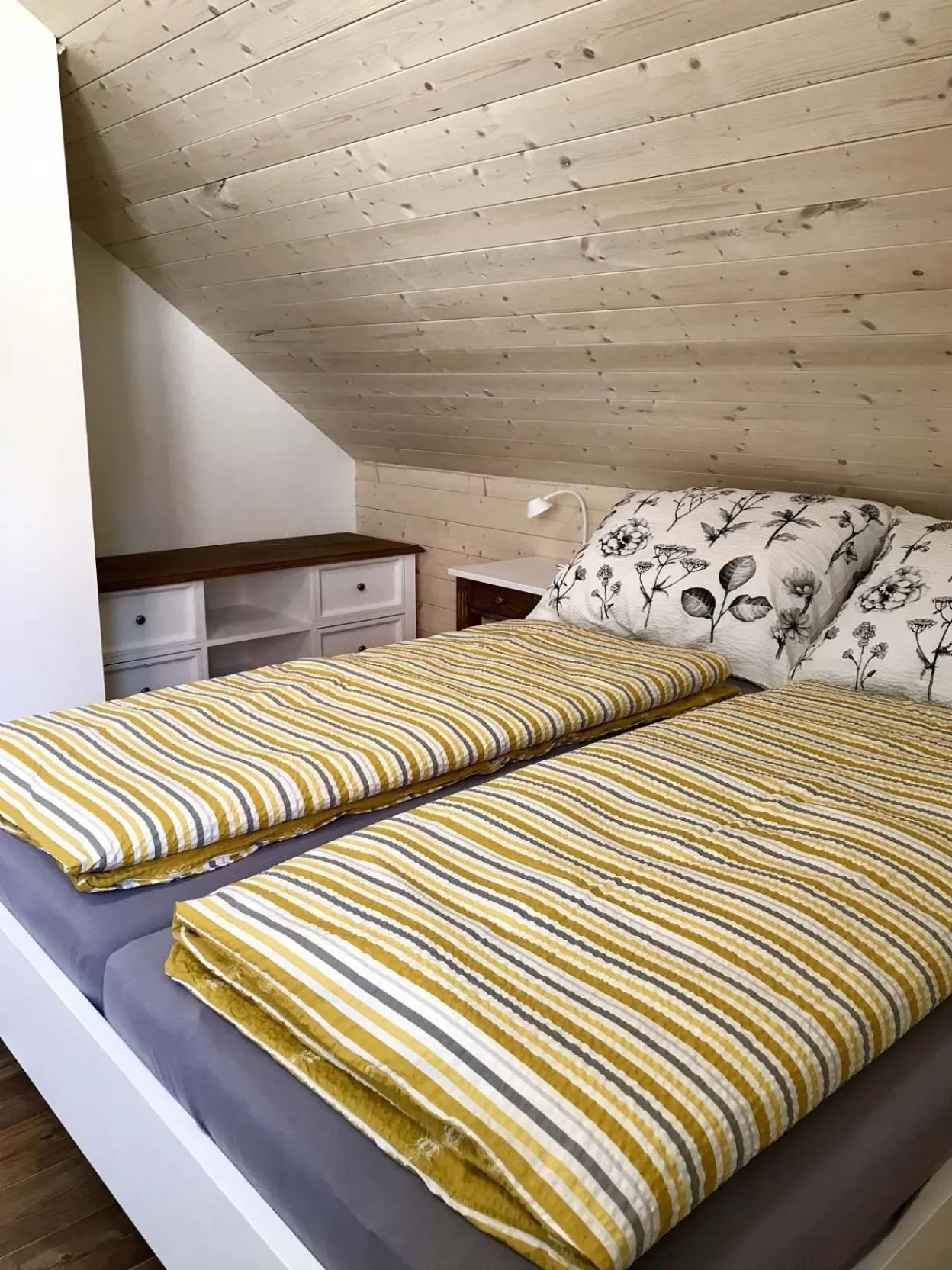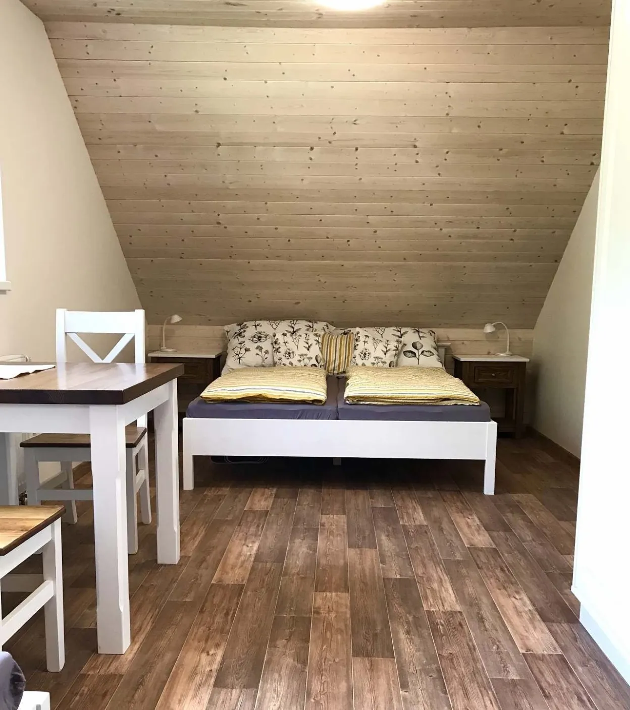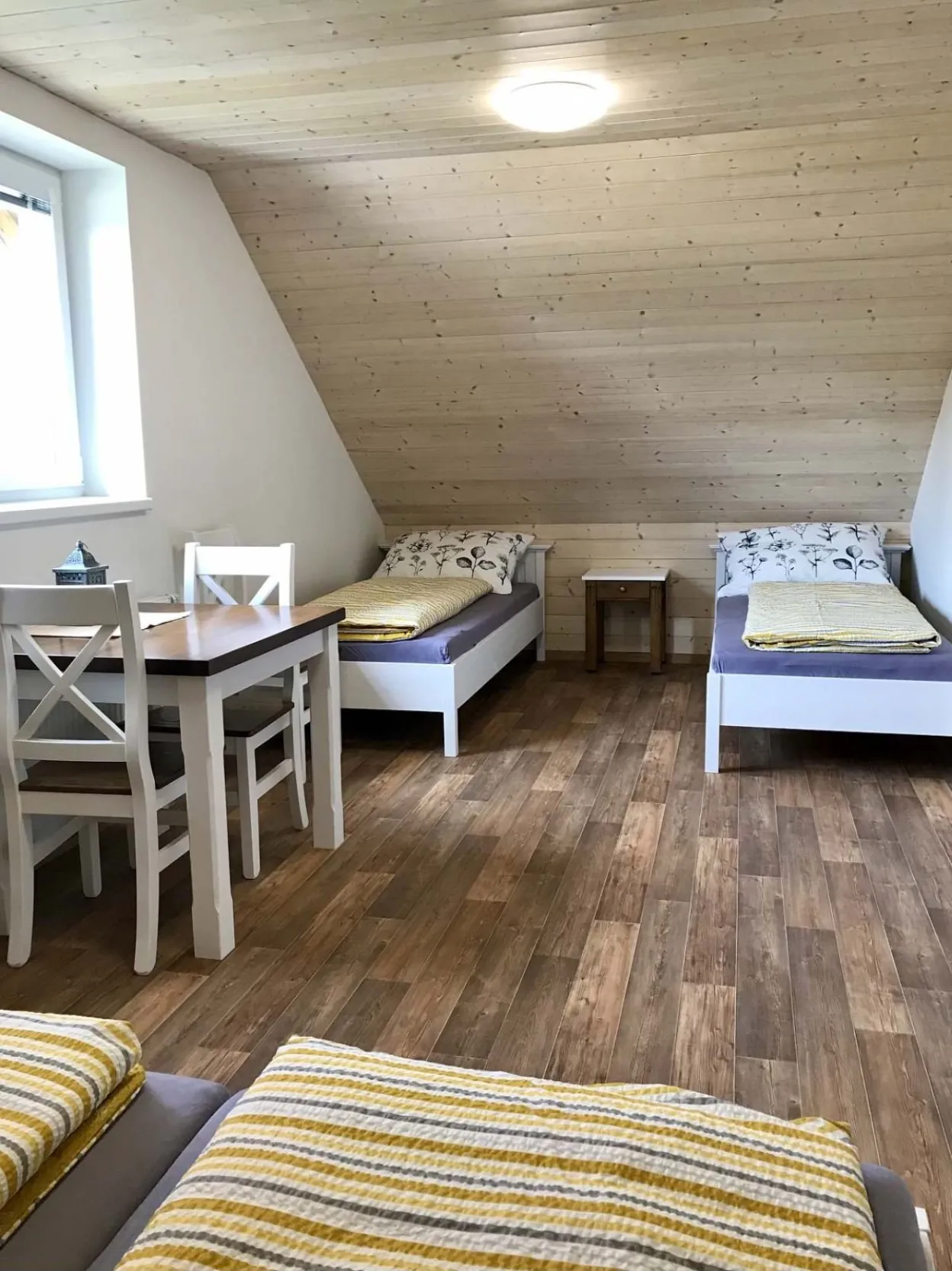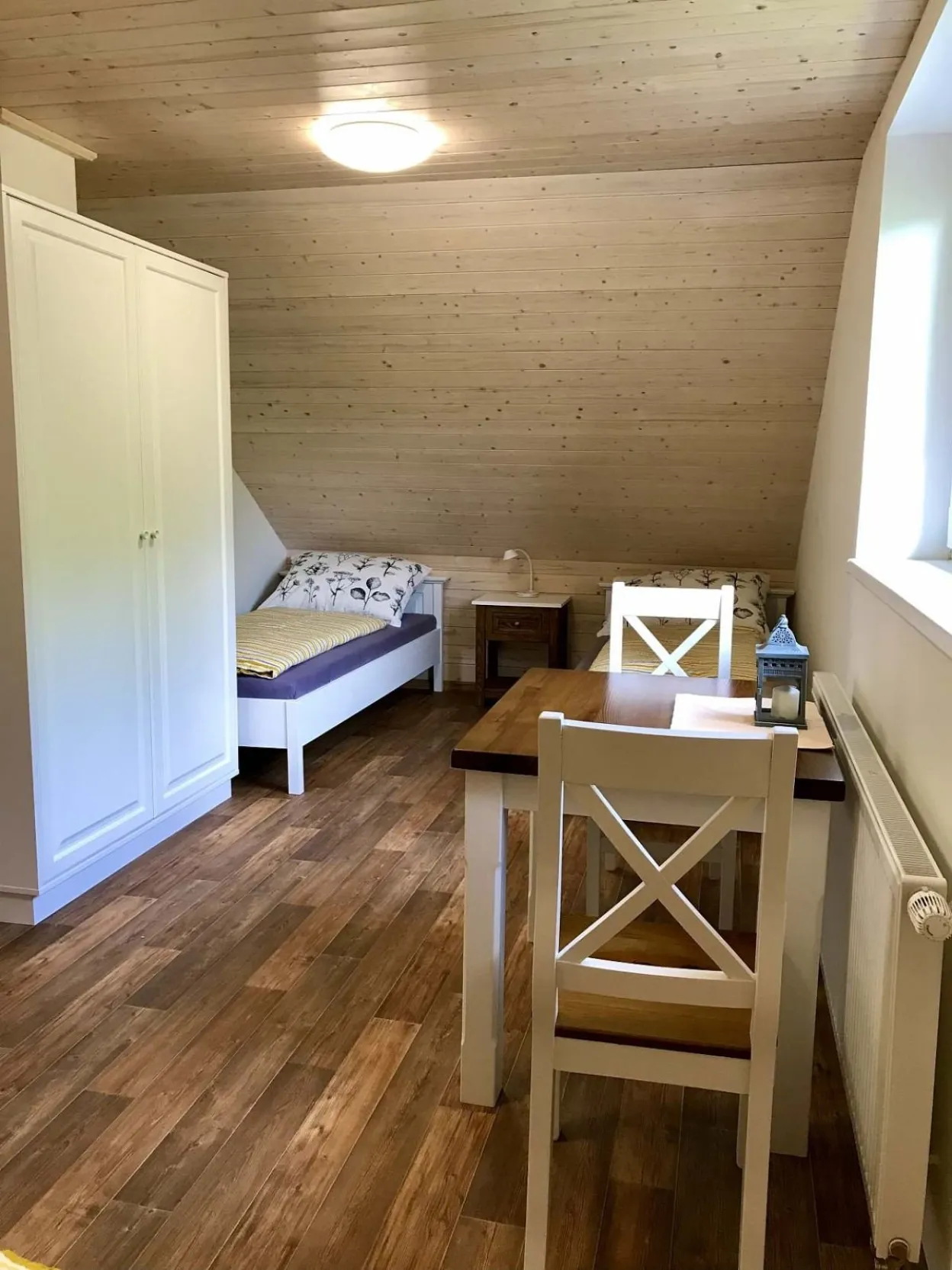 2 samostatné ložnice nahoře. Vždy manželská postel a 2 samostatné postele, velká skříň, stůl a 4 židle.