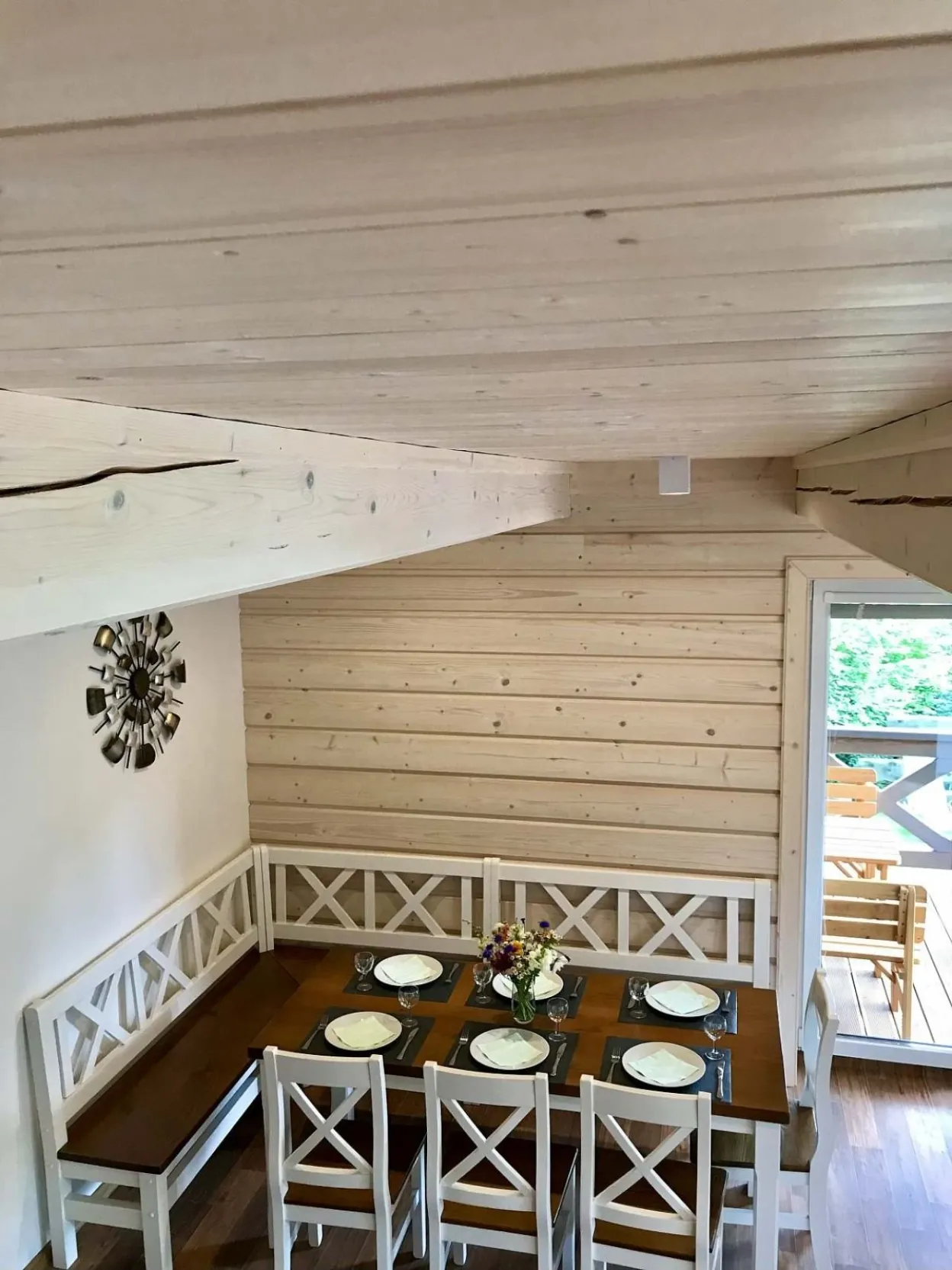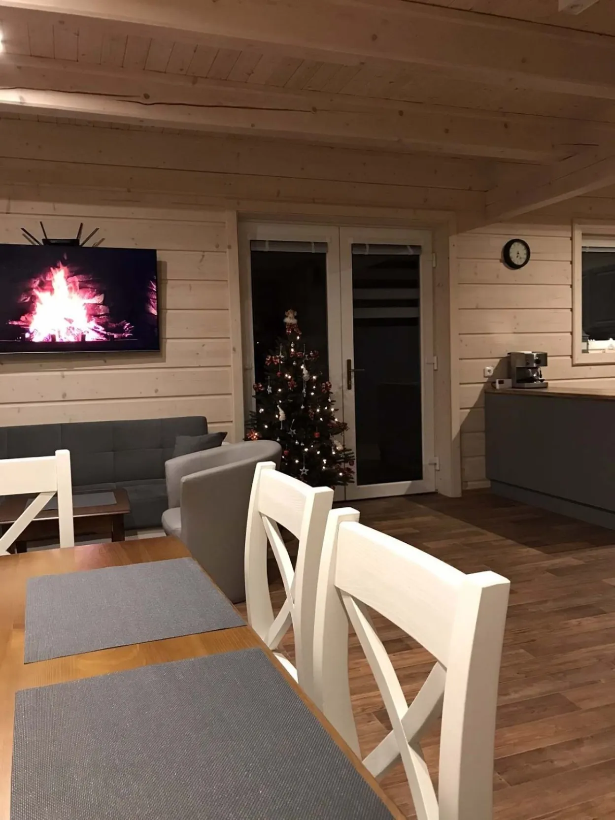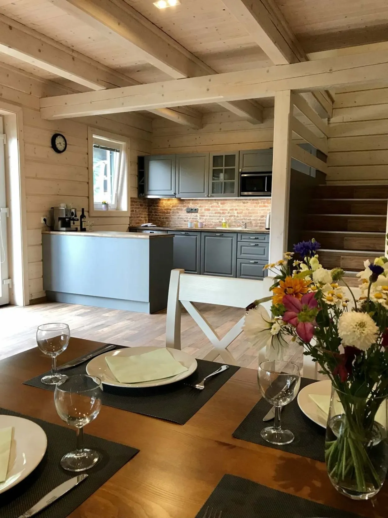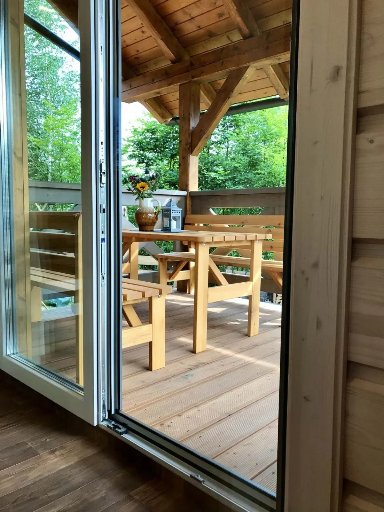 Přízemí je velmi prostorné, na oslavy a společné chvíle ideální. Výhledy z terásky do zeleně jsou úžasné. Večer si můžete něco opéct na elektrickém grilu.