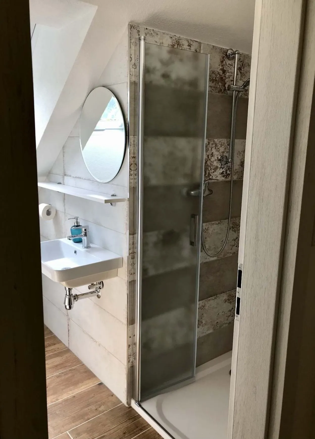 2 koupelny se sprchovým koutem, umyvadlem a toaletou. Jedna v přízemí větší a jedna nahoře menší
