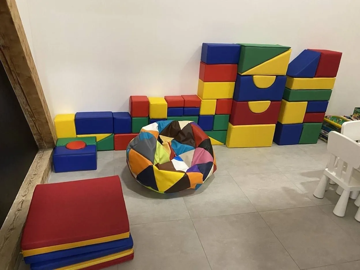 2NP: Po schodišti v druhém patře se dostanete ke dvěma společným WC, kde jedno je uzpůsobeno pro osoby s omezenou hybností. Dále je zde vstup do dvoupatrového dětského koutku plného stolních her, molitanových kostek, žíněnek, prolézaček a žebříku do druhého patra.