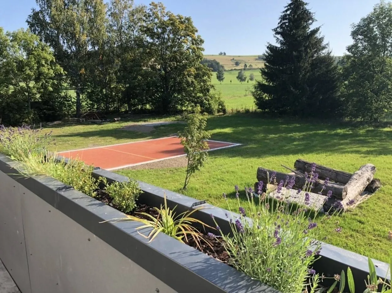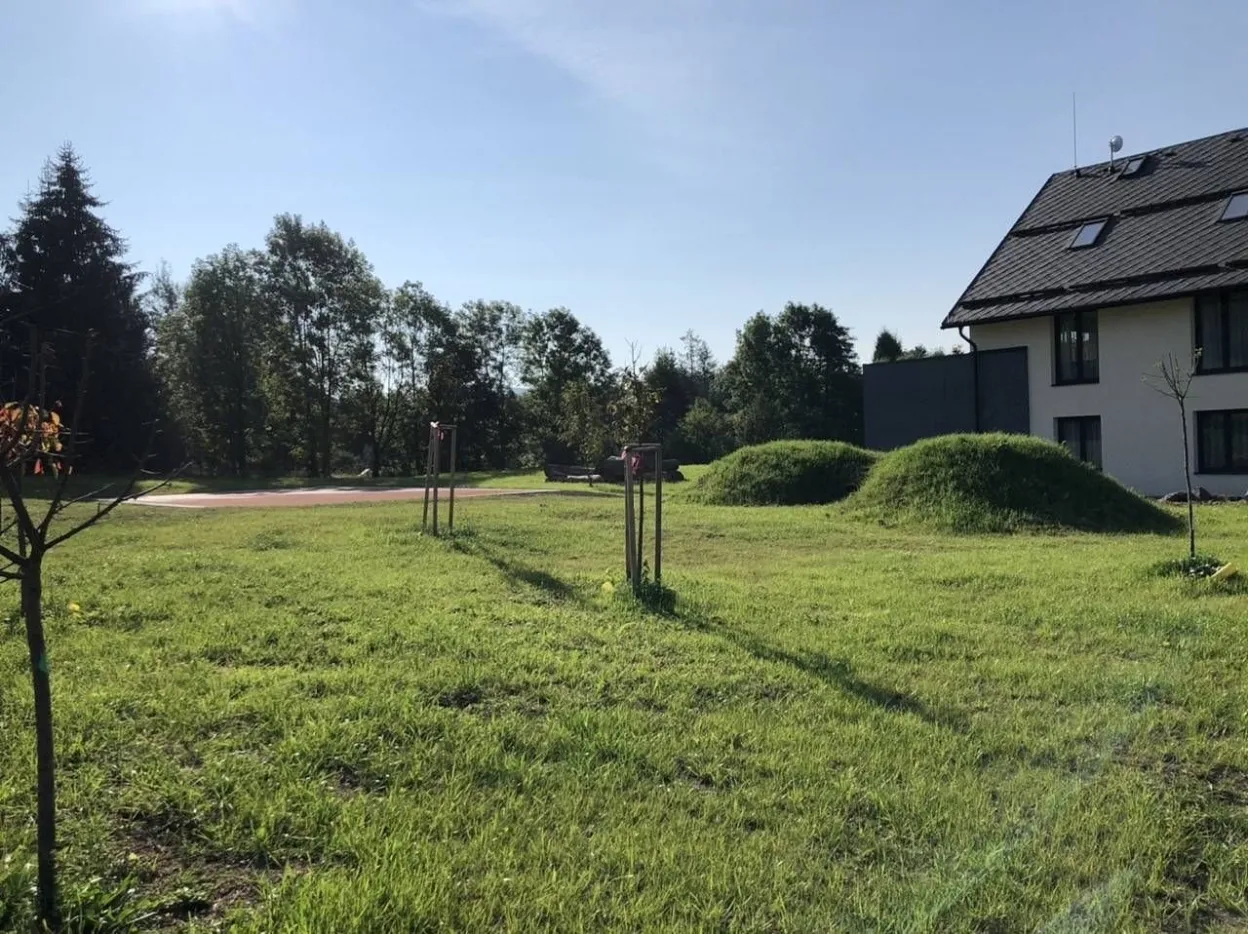 Venkovní plocha u terasy má travnatý udržovaný povrch s rybníčkem a písečným břehem sloužícím jako pískoviště. V letních měsících se můžete těšit na plody ovocných stromů z našeho sadu ( jabloně, hrušně, třešně).