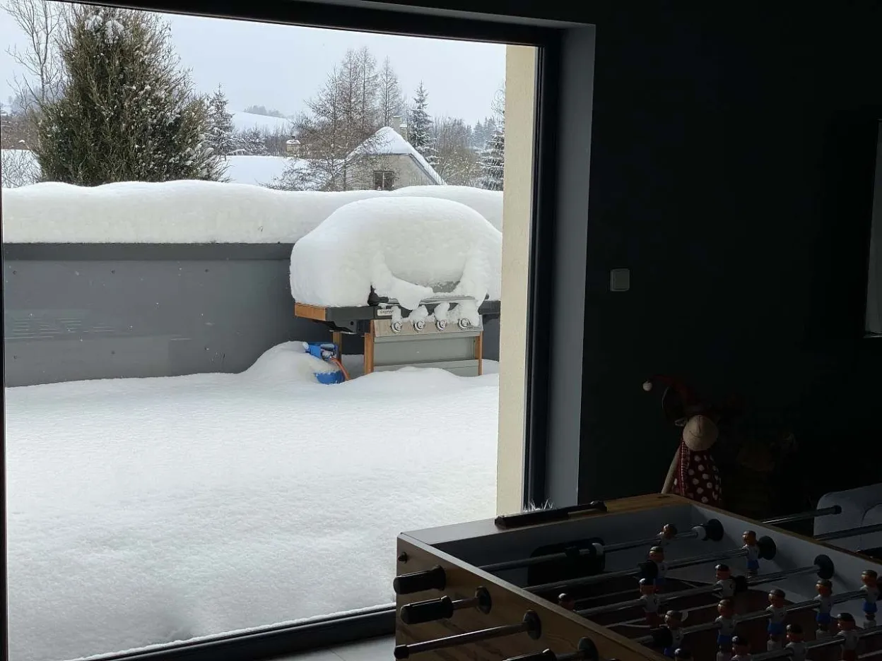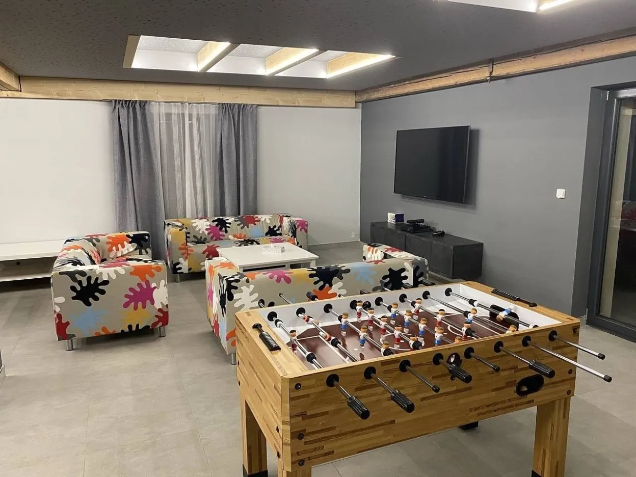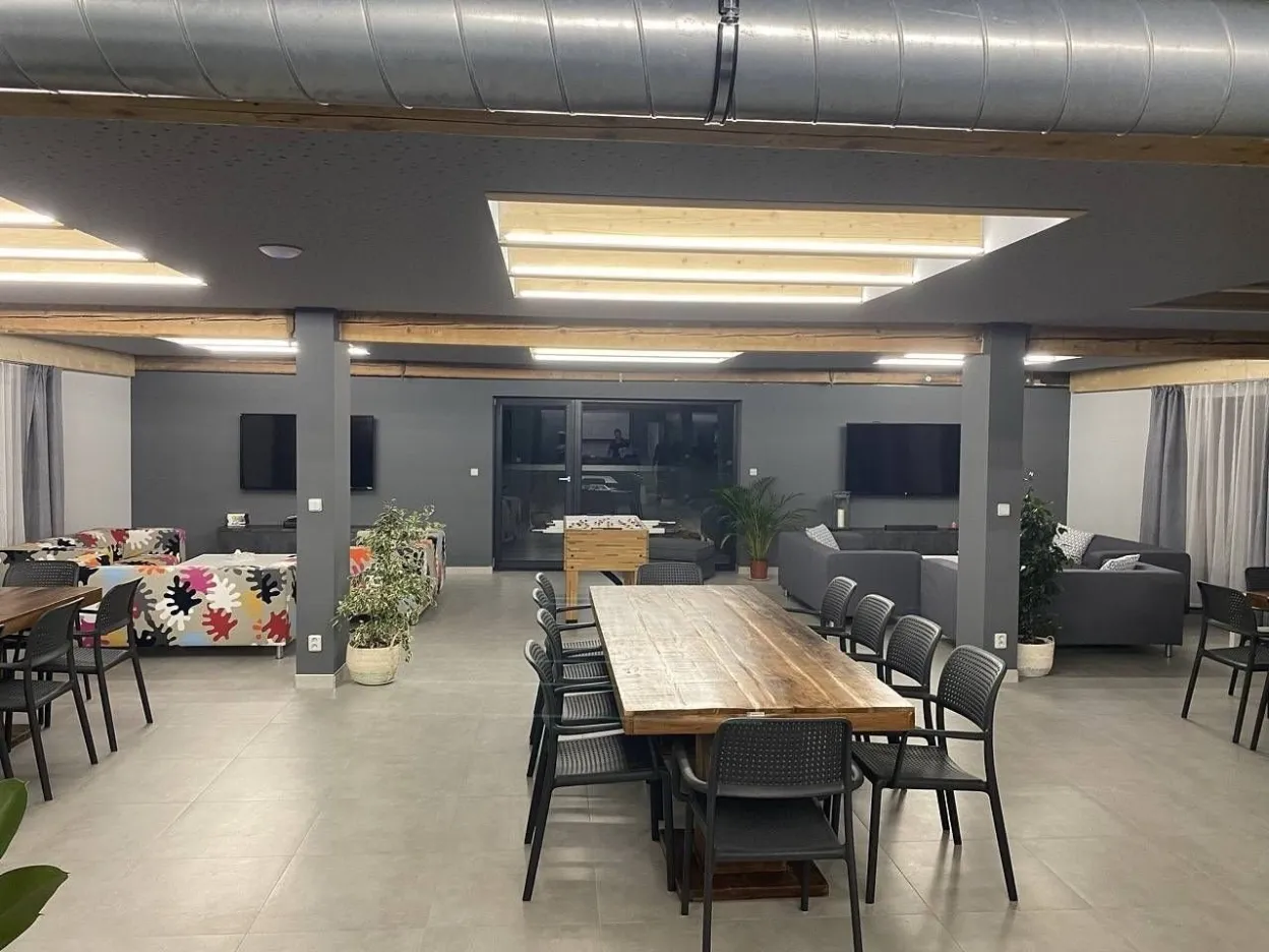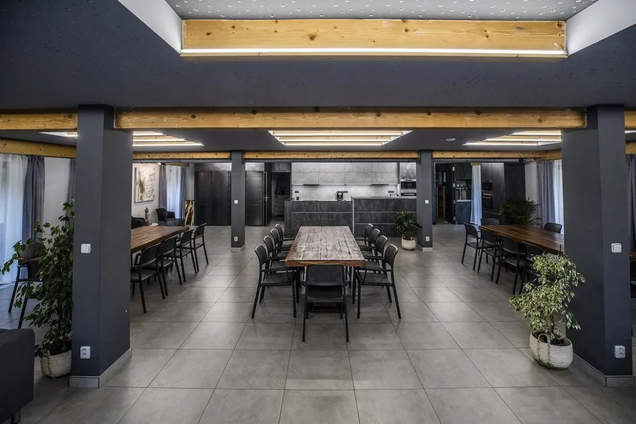 V druhé části - jídelně - jsou 3 velké, dřevěné stoly variabilně uzpůsobitelné pro Vaše potřeby stolování s celkovou kapacitou 32 židlí. V zadní obývací části této velké místnosti je potom relax zóna pro děti s velkoplošnou TV, připojenou k wi - fi, SKYLINK, TV anténě, herní konzoly X - Box Kinect 360 s hrami a konzoly PlayStation PS3 s hrami, projektor s plátnem, tři dvousedačkové gauče. V relaxu pro dospělé je také velkoplošná TV připojená k wi - fi, SKYLINK, TV anténa, tři dvousedačkové pohovky, dva sedáky, DVD přehrávač. K dispozici i je stolní fotbálek. Z tohoto prostoru je přístupná terasa se dvěma stoly a 12 křesly, venkovní plynový gril Campingaz woody LX, elektrická udírna KAISEROVA 60 ELEKTRICKÁ UDÍRNA S GRILEM. Z této terasy se lze dostat po venkovním schodišti na spodní terasu před wellnes a k venkovnímu koupacímu sudu pro 8 osob.