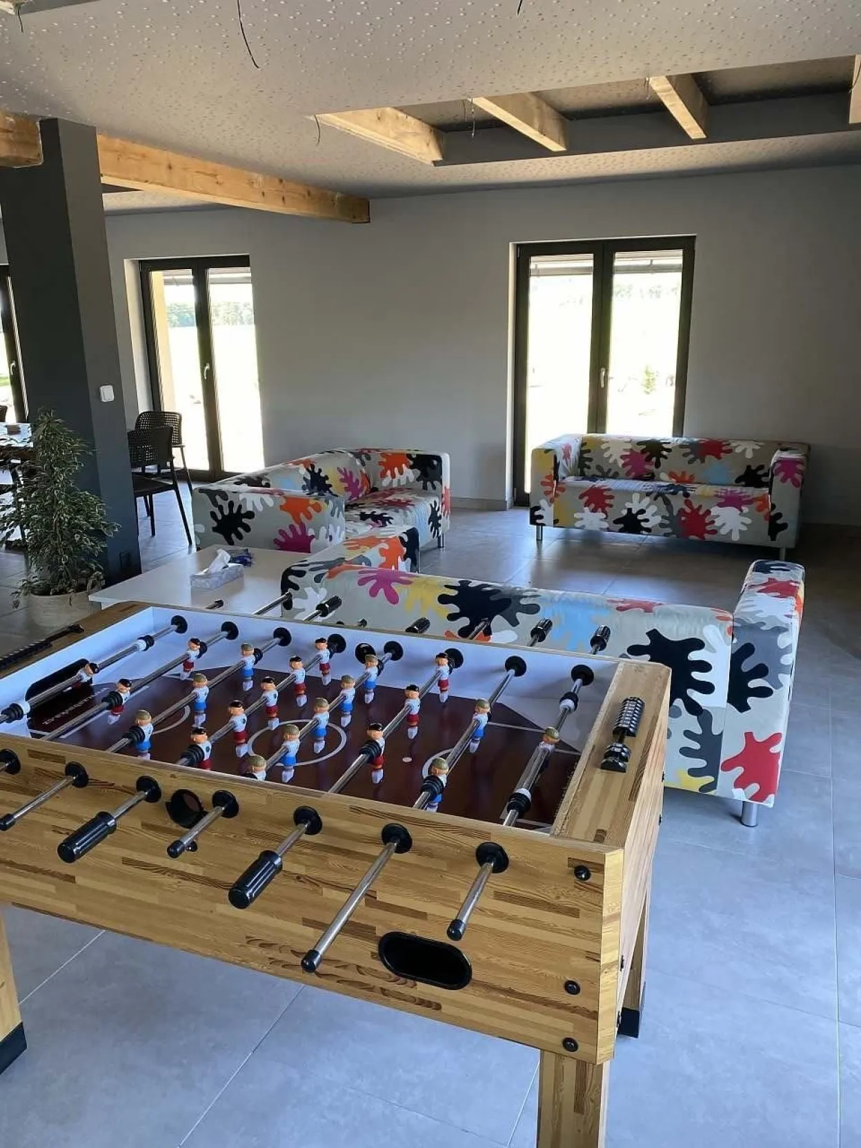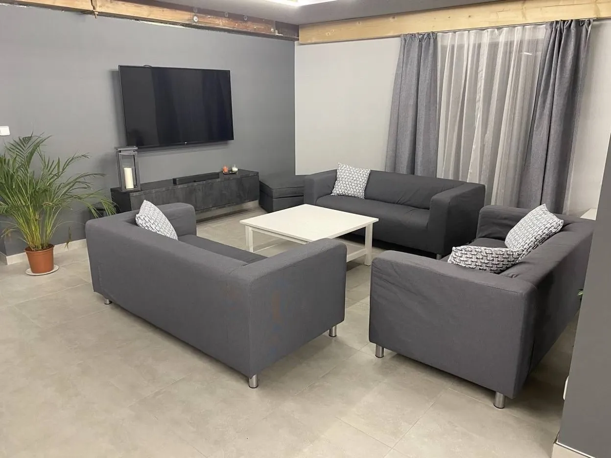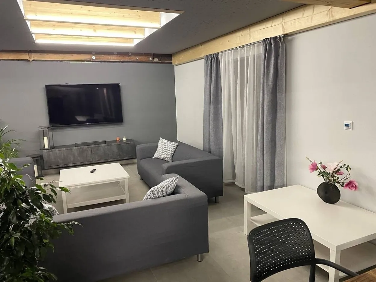 V druhé části - jídelně - jsou 3 velké, dřevěné stoly variabilně uzpůsobitelné pro Vaše potřeby stolování s celkovou kapacitou 32 židlí. V zadní obývací části této velké místnosti je potom relax zóna pro děti s velkoplošnou TV, připojenou k wi - fi, SKYLINK, TV anténě, herní konzoly X - Box Kinect 360 s hrami a konzoly PlayStation PS3 s hrami, projektor s plátnem, tři dvousedačkové gauče. V relaxu pro dospělé je také velkoplošná TV připojená k wi - fi, SKYLINK, TV anténa, tři dvousedačkové pohovky, dva sedáky, DVD přehrávač. K dispozici i je stolní fotbálek. Z tohoto prostoru je přístupná terasa se dvěma stoly a 12 křesly, venkovní plynový gril Campingaz woody LX, elektrická udírna KAISEROVA 60 ELEKTRICKÁ UDÍRNA S GRILEM. Z této terasy se lze dostat po venkovním schodišti na spodní terasu před wellnes a k venkovnímu koupacímu sudu pro 8 osob.