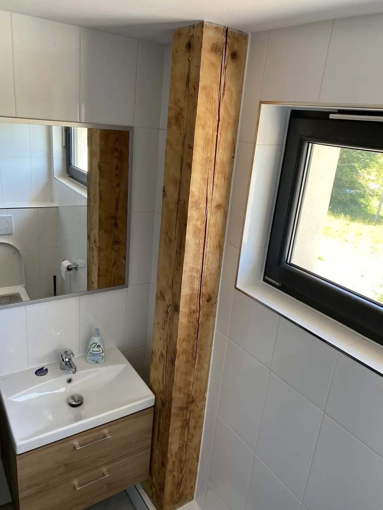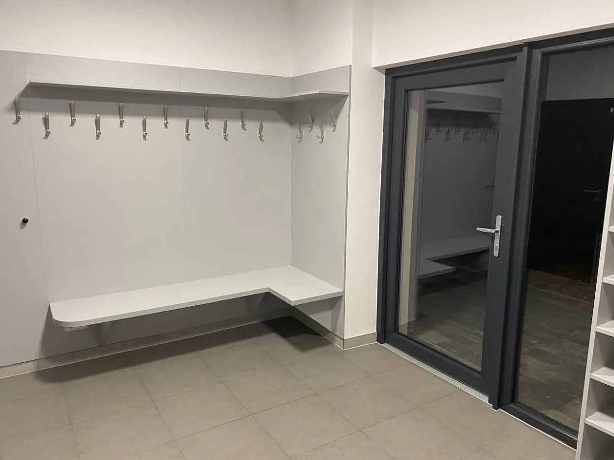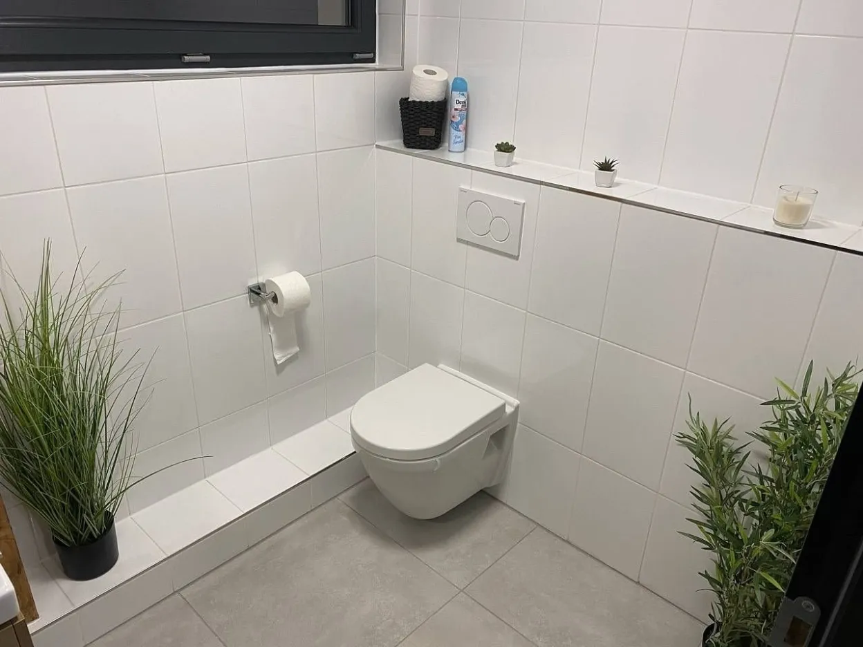 1NP: Společné WC a v každém ze čtyř apartmánů jedno samostatné. Každá koupelna obsahuje wc, sprchový box, umyvadlo se skříňkou, zrcadlo, odvětrání, horkovodní žebřík. Další wc je přístupné při využívání sauny.