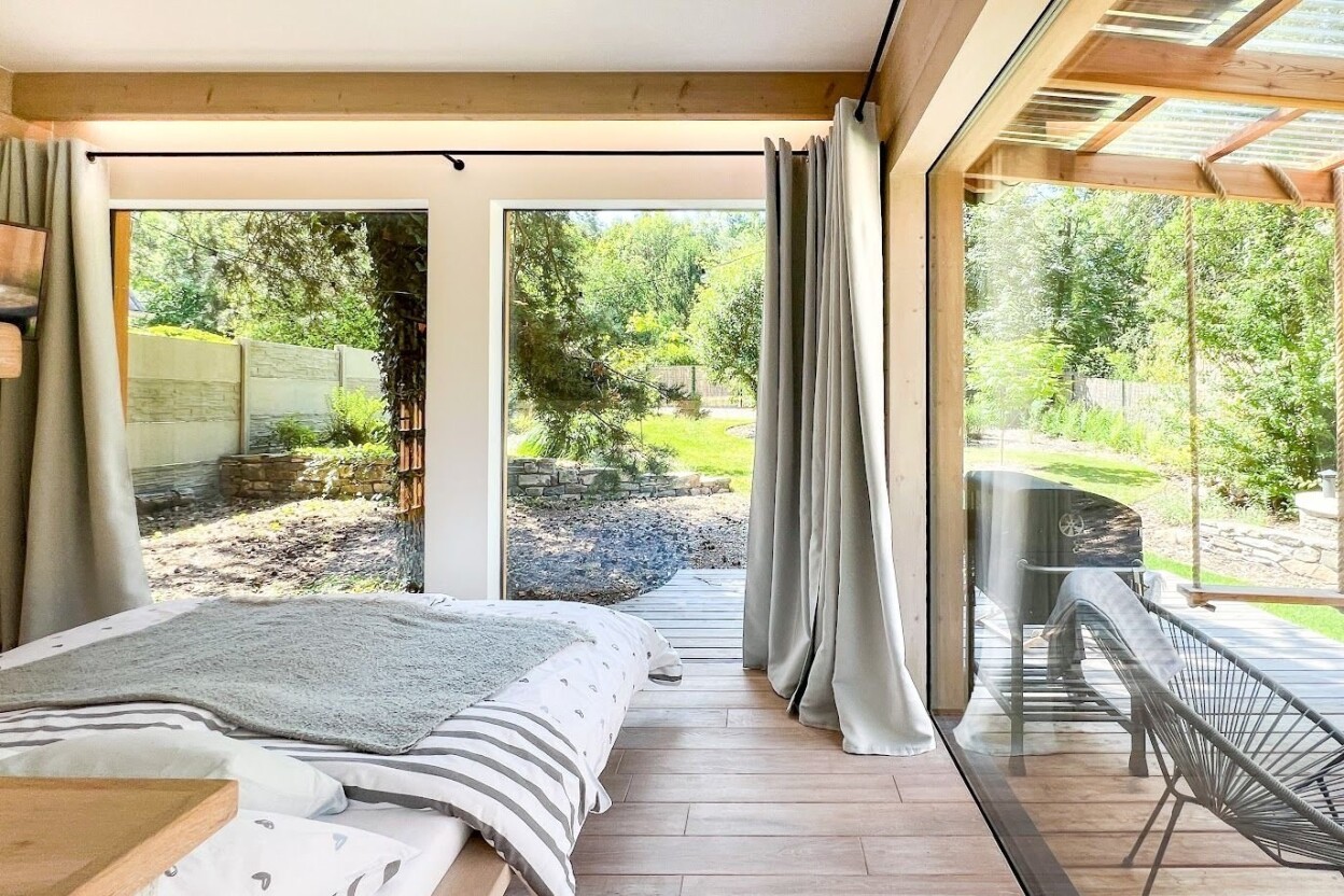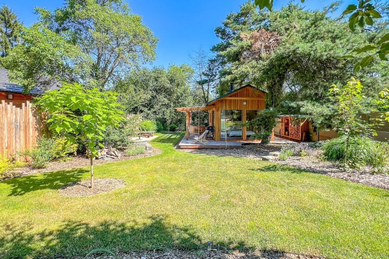 Přijeďte načerpat sílu. Moderní a elegantní design s vůní dřeva, jednoduchost a zároveň promyšlené detaily. Útulná velká terasa s příjemným posezením a grilem, další možnost posezení u otevřeného ohniště nebo relax v hamace ve stínu vzrostlých stromů.
