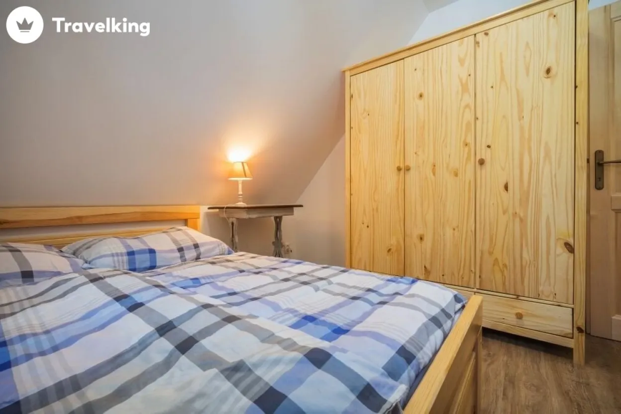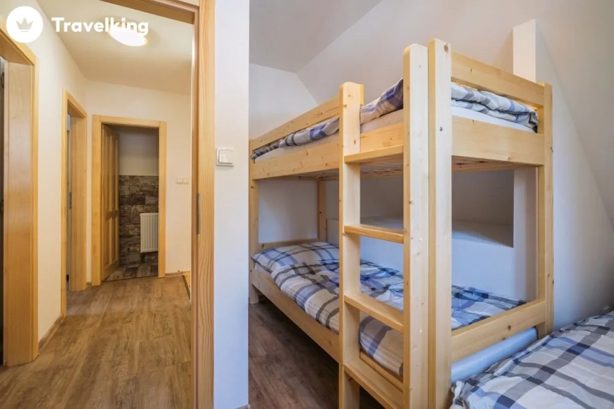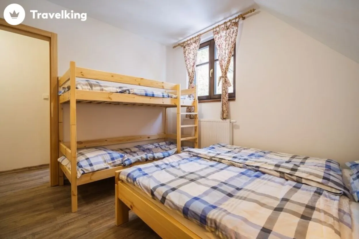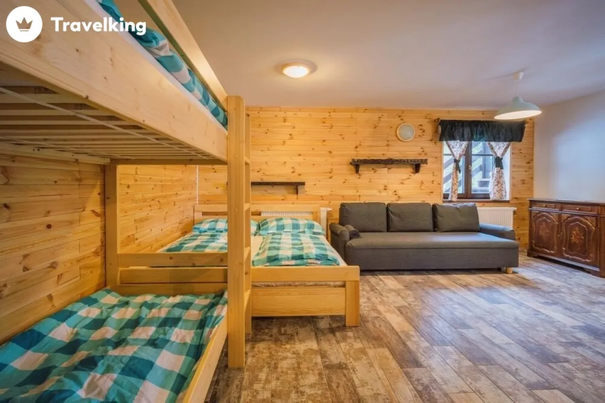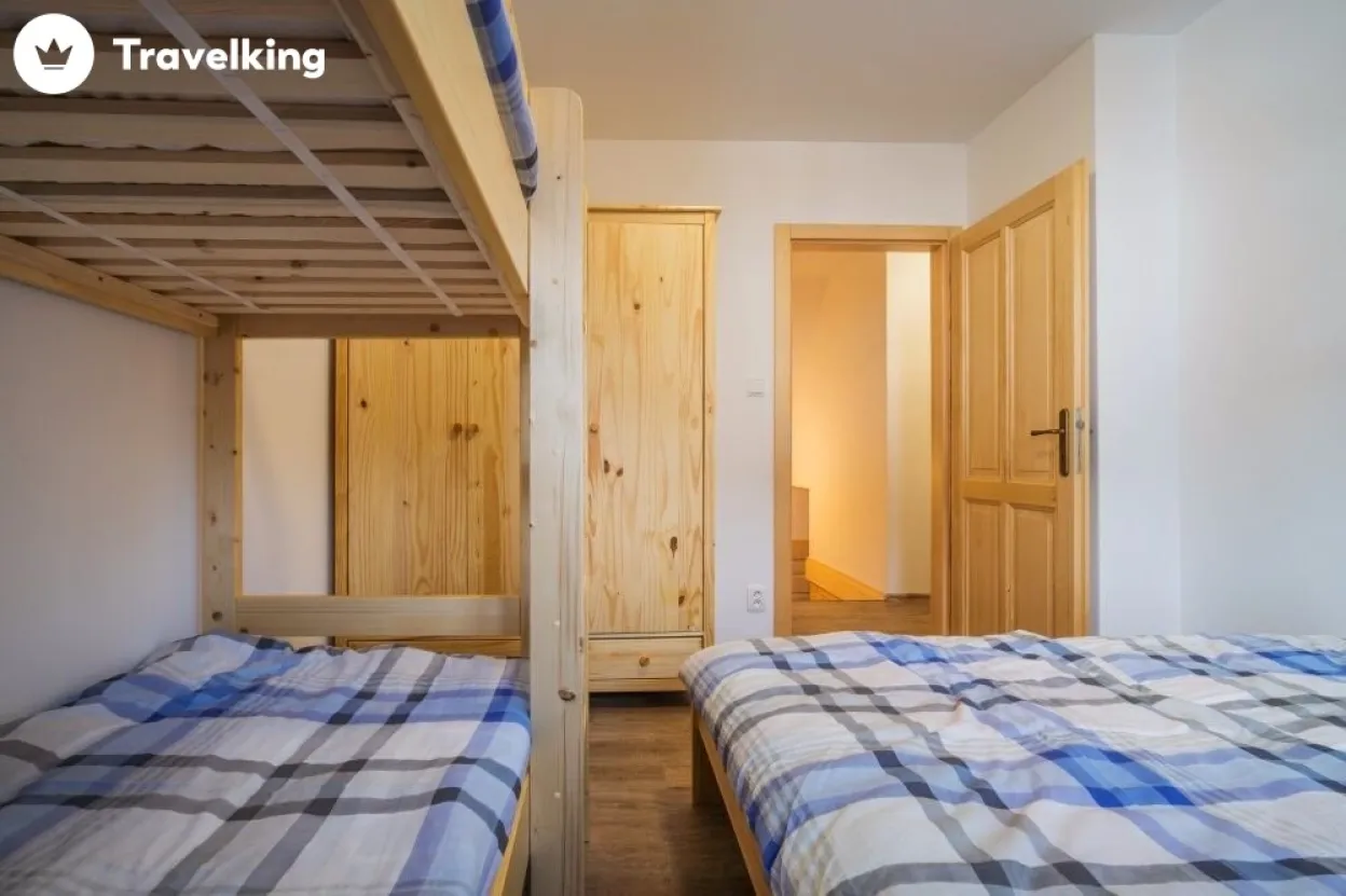 Velký apartmán pro 7 - 9 osob se nachází v prvním patře. Apartmán je přístupný po schodech a ochozu, který je kolem celé chalupy a je z něj krásný výhled na okolní krajinu. Ve spodní části se nachází předsíň, velká a plně vybavená kuchyně a jídelna. Je zde také rozkládací gauč pro 2 osoby a koupelna se sprchovým koutem a WC. Topit zde můžete krásnými litinovými kamny nebo ústředním topením. V patře se nachází 3 ložnice se 7 pevnými lůžky, úložnými skříněmi a možností 2 přistýlek. Ve dvou ložnicích jsou 2 lůžka a v jedné jsou 3 lůžka (samostatné lůžko a patrová postel).