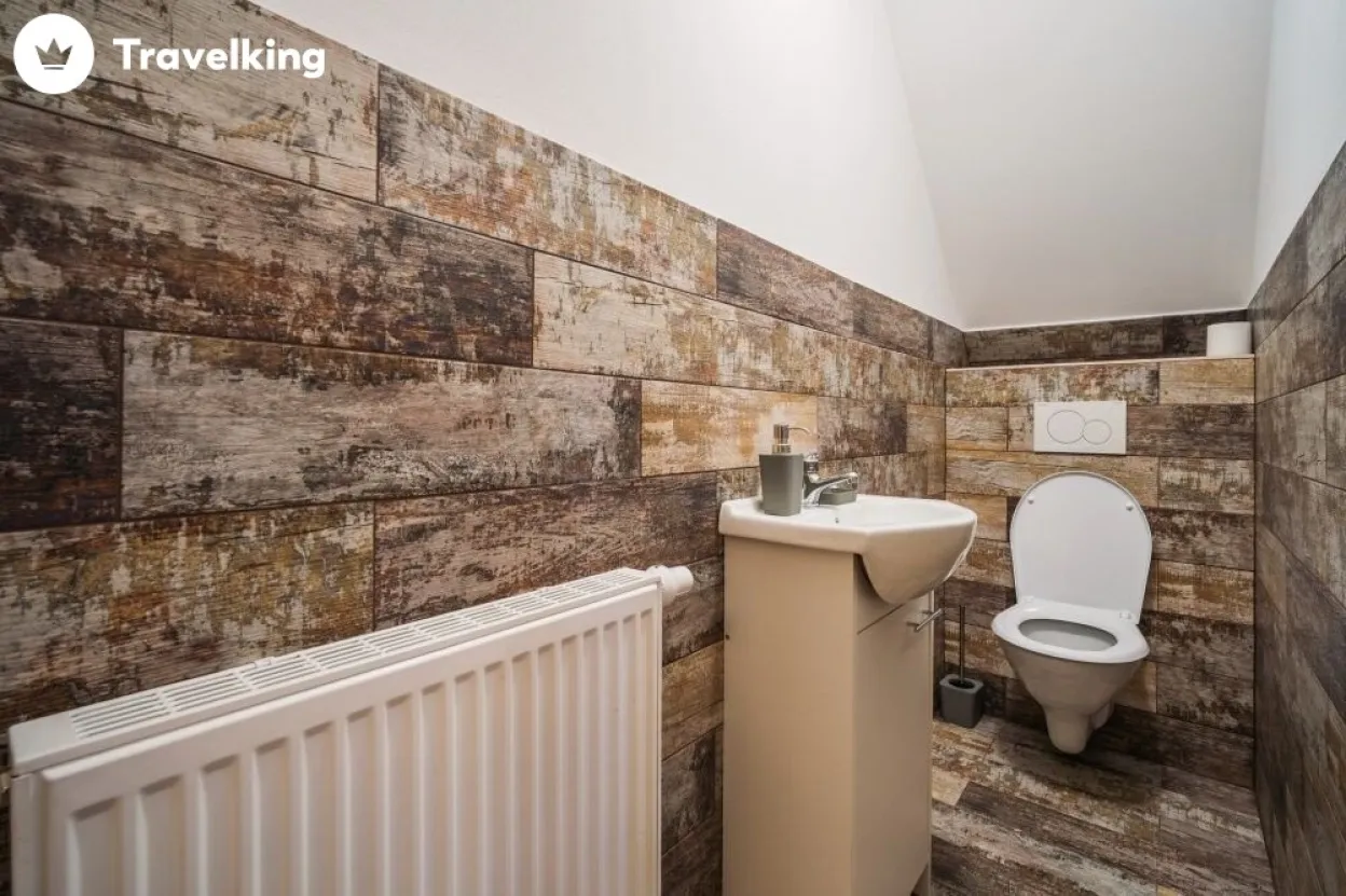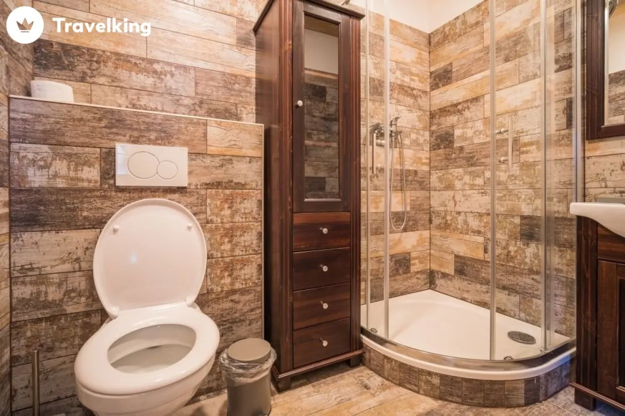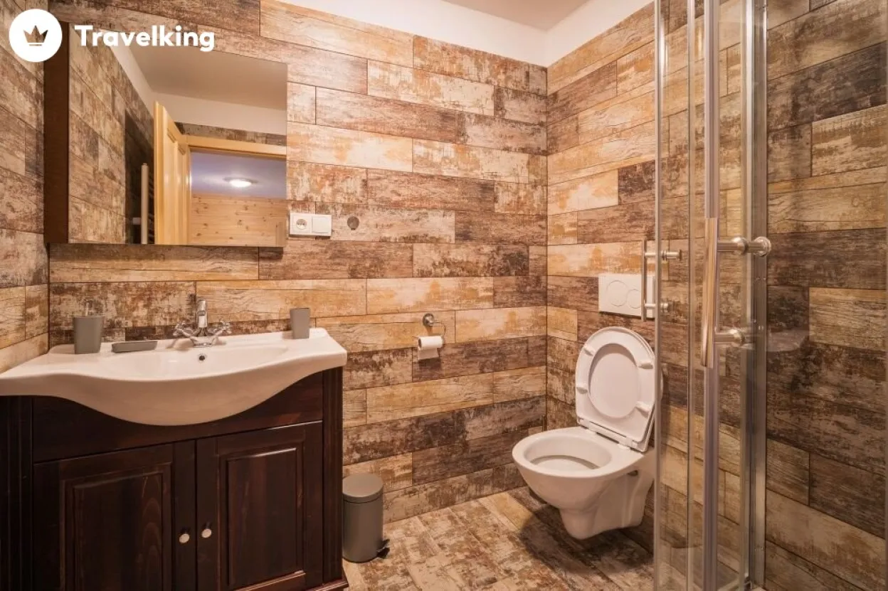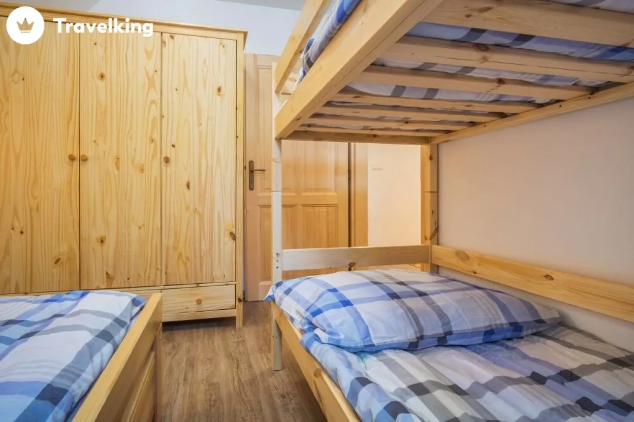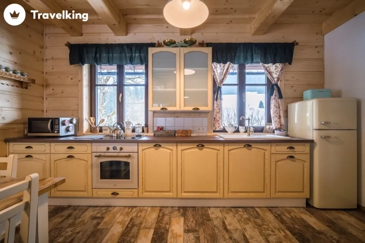 Velký apartmán pro 7 - 9 osob se nachází v prvním patře. Apartmán je přístupný po schodech a ochozu, který je kolem celé chalupy a je z něj krásný výhled na okolní krajinu. Ve spodní části se nachází předsíň, velká a plně vybavená kuchyně a jídelna. Je zde také rozkládací gauč pro 2 osoby a koupelna se sprchovým koutem a WC. Topit zde můžete krásnými litinovými kamny nebo ústředním topením. V patře se nachází 3 ložnice se 7 pevnými lůžky, úložnými skříněmi a možností 2 přistýlek. Ve dvou ložnicích jsou 2 lůžka a v jedné jsou 3 lůžka (samostatné lůžko a patrová postel).