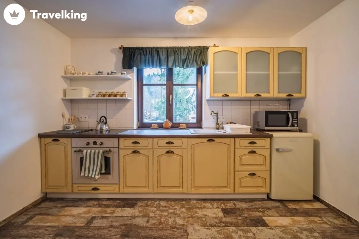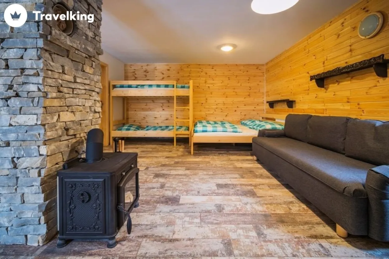 Malý apartmán v suterénu je určen pro 4 - 6 osob. Tvoří ho předsíň a jídelní kout s plně vybavenou kuchyňskou linkou. Posedět můžete u stylového jídelního stolu s rohovou lavicí a židlemi. V koupelně se nachází sprchový kout, umyvadlo a WC. Odpočinout si můžete na manželské či patrové posteli nebo rozkládací pohovce pro 2 osoby. Kromě plynového ústředního topení Vám příjemnou chalupářskou atmosféru navodí litinová kamna.