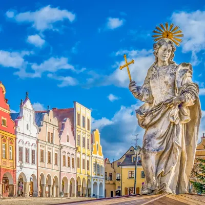 Prekrásne námestie Zachariáša z Hradca lemuje jedinečný súbor gotických a renesančných meštianskych domov s arkádami a renesančnými, barokovými a klasicistickými zdobenými štítmi.